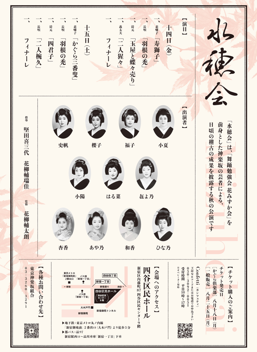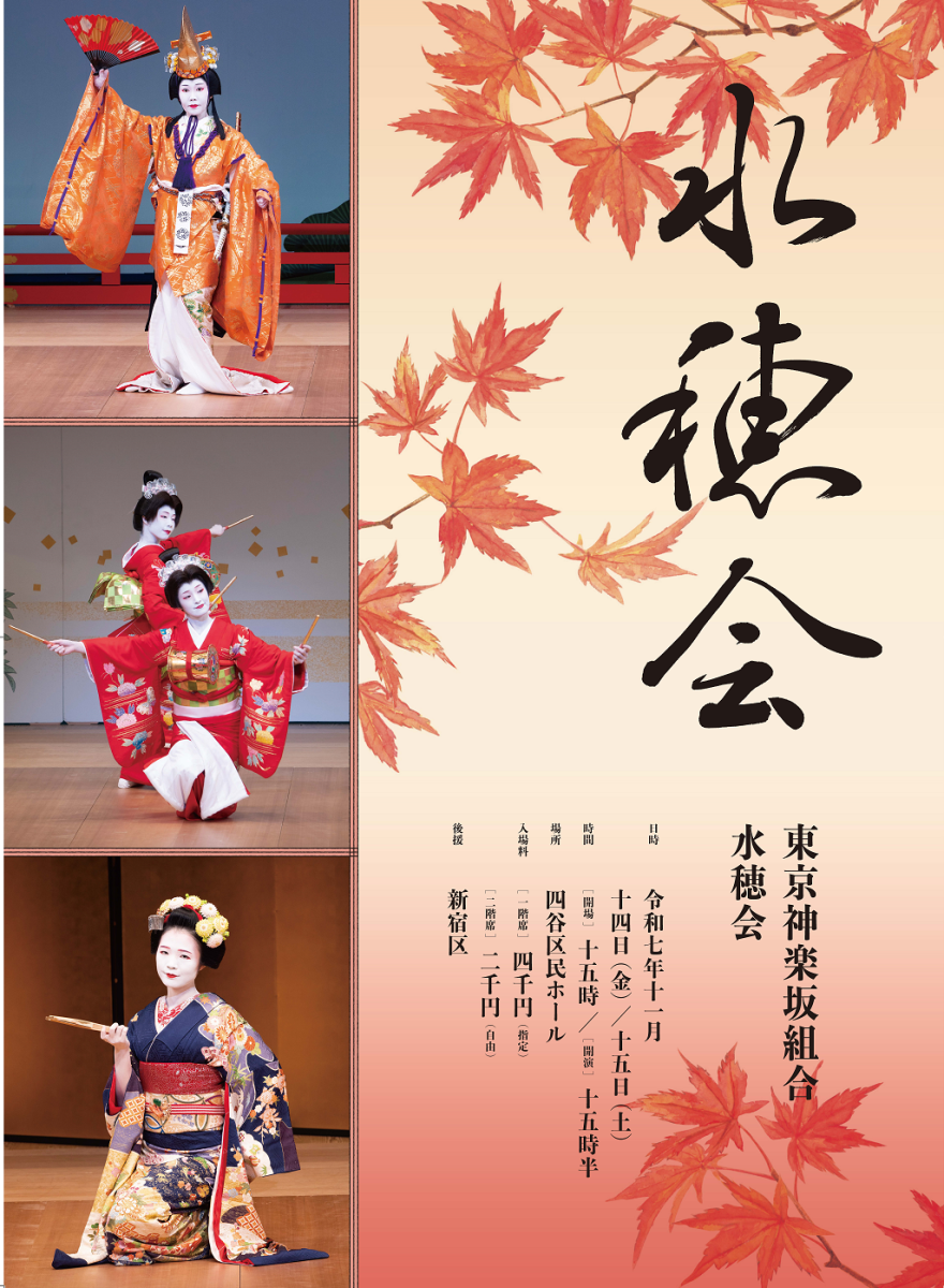 令和7年11月14日(金)・15日(土)の2日間、 四谷区民ホールにて【神楽坂芸妓組合 「第3回 水穂会」】が開催されます。「水穂会」は「舞踊勉強会 花みずか会」を前身とした神楽坂の芸者による、日ごろの稽古の成果を披露する秋の公演です。