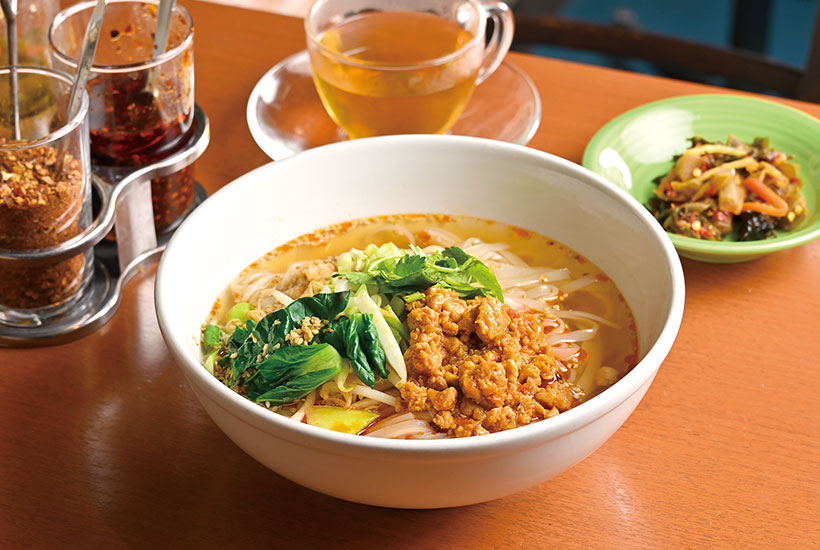 高田馬場駅から徒歩1分の雑居ビルにある、老舗のミャンマー料理店。ミャンマー北部を中心に暮らすシャン民族の食文化にふれられる、日本でも数少ない場所だ。1997(平成9)年の開業以来、シャン州出身者も多く訪れる。店内は、ミャンマー語が飛び交い、現地さながらの雰囲気。名物の「シャンカウスェ」は、もちもちとした米麺に、丸鶏のあっさりとしたスープが絡み、ナッツやパクチーがアクセントとなっている。スタッフのスティップさんは「シャンカウスェは、家族団らんや親しい人と囲む食卓に欠かせない料理」と話す。また、同店では昆虫食も提供しており、珍しい食体験もできる。同ビル4階には、系列店のミャンマー食材が買えるお店やカフェも。