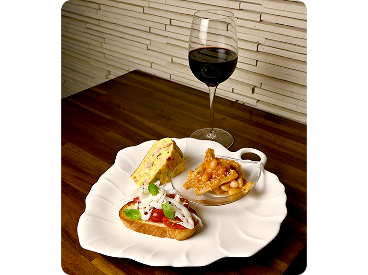おまかせ前菜3種 1,500円 グラスワイン 950円~